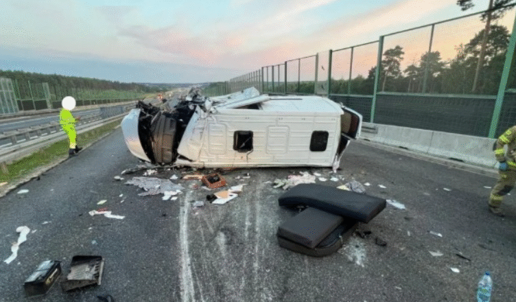 Służby opublikowały w mediach społecznościowych krótki komunikat i zdjęcia z miejsca zdarzenia. Jak widać, bus po zderzeniu przewrócił się na bok. Pojazd został poważnie zniszczony.