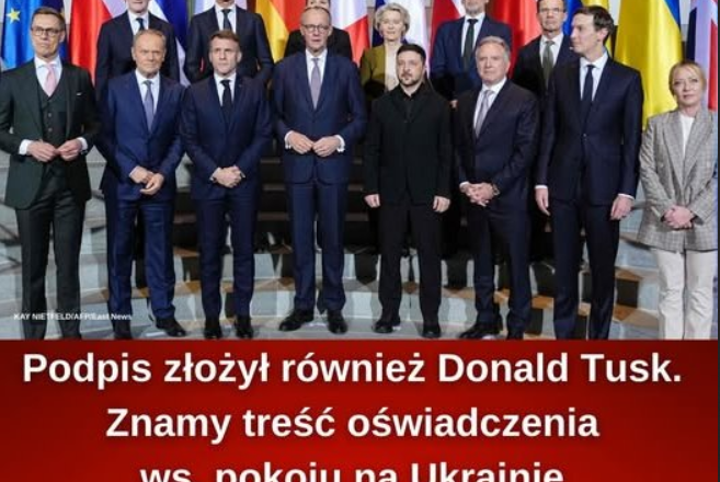 Dokument podpisali m.in. premier Donald Tusk, prezydent Emmanuel Macron, premier Giorgia Meloni, kanclerz Merz, a także przewodniczący Rady Europejskiej António Costa, przewodnicząca Komisji Europejskiej Ursula von der Leyen oraz sekretarz generalny NATO Mark Rutte.